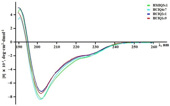 To calculate secondary structural elements of peptides, circular dichroism (CD) spectroscopy was applied. CD spectroscopy is a fast, well-established, and widely used analytical technique to study secondary structures of proteins and their changes in different environments []. According to Figure 3, all spectra in the far UV region (190–240 nm) have similar profiles and are characterized by a positive maximum peak at 193 nm and negative minimum peaks at 202 and 225 nm. The peaks at 193 and 225 nm indicate the presence of α-helixes and β-strands, respectively, while the small magnitude of the 225 nm peak and contribution of the signal at 215 nm suggest that the peptides are partially folded. Indeed, analysis of the spectra using the Provencher–Glockner method revealed that all peptides contain both α-helixes and β-strands and an unordered structure. The peptides have an approximately equal content of secondary structural elements, while a slight increase in α-helixes and decrease in β-structure were found in HCIQ1c9 (Table 1), which might be reflected in the spatial structure and biological activity of the peptide. A comparison of peptide structures with the Kunitz-type peptides InhVJ from H. crispa [] and SHPI-1 from S. helianthus [], revealed similar values of secondary structural elements.