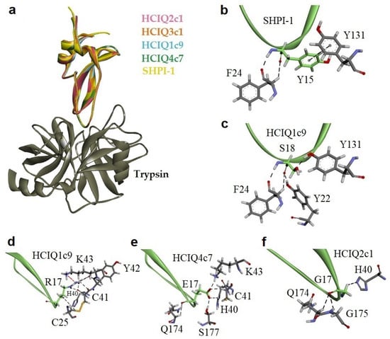 Comparative models of the peptide complexes with trypsin. (a) Ribbon representation of peptide complexes. Intermolecular interactions of residues at positions P1’ (b,c) and P2’ (d–f) with trypsin molecule. Residues are presented as sticks; hydrogen, oxygen, nitrogen, and sulfur atoms are colored in white, red, blue, and orange, respectively. Interactions are shown as dotted lines, unfavorable interactions between Arg17 of HCIQ1c9 and Lys43 of trypsin are shown in red.