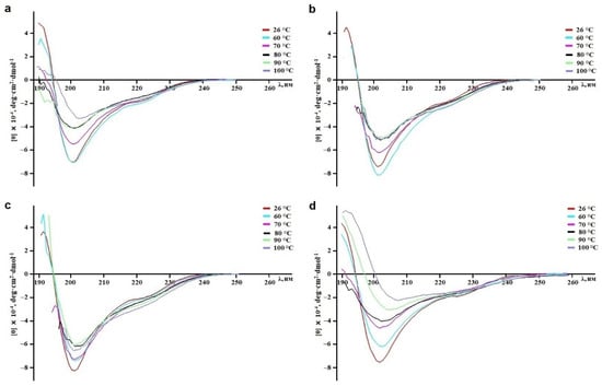 Circular dichroism (CD) spectra were recorded on a Chirascan-Plus CD spectropolarimeter (Applied Photophysics, Leatherhead, UK) in quartz cuvettes with an optical path length of 0.1 cm for the peptide spectrum region. The peptides were dissolved in deionized water (40 ng/mL) and incubated at temperatures ranging from 25 °C to 100 °C for 20–25 min before recording the CD spectra. The secondary structure elements were calculated using the Provencher–Glockner method [] using advanced Provencher calculation programs from the CDPro software package (Leatherhead, UK) [].