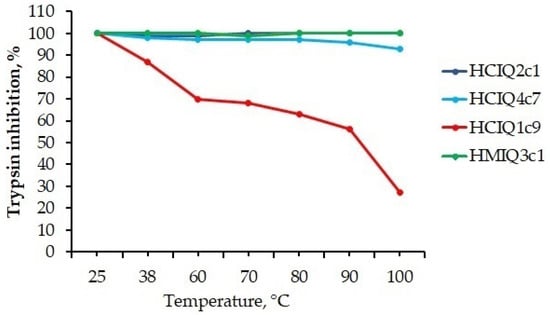 The temperature effects on the secondary structure and biological activity of peptides were analyzed using both CD spectroscopy and a protease-inhibitory assay. The CD spectra of HCIQ2c1 and HCIQ4c7 as well as of HMIQ3c1 and HCIQ1c9 solutions showed no significant changes after heating until 90 °C and 80 °C, respectively (Figure 5). Further heating of the solutions to 100 °C resulted in decreased positive peaks at 193 nm in HCIQ2c1, HCIQ4c7, and HMIQ3c1 spectra, as well as decreased spectral peaks at 202 and 225 nm in the HCIQ1c9 spectrum, indicating a reduction in α-helixes in the former and the initiation of protein unfolding in the latter. These data were confirmed by the trypsin-inhibitory activity results (Figure 6). HCIQ2c1 and HMIQ3c1 were shown to inhibit trypsin completely at all temperature ranges, including at 100 °C, while HCIQ4c7 activity was weakly decreased (by 7%) after heating to 100 °C. Regarding HCIQ1c9, the heating of the solution in the range from 60 °C to 100 °C resulted in decreases in inhibitory activity of 30–70%. Thus, the obtained results indicated that HCIQ2c1, HMIQ3c1, and HCIQ4c7 have high thermostability, retaining their conformation on the secondary structural level and their biological activity until 90–100 °C.