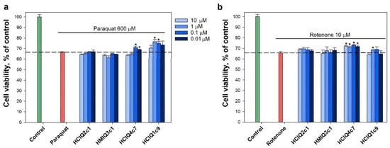The peptides were tested for cell viability in in vitro 6-OHDA-, rotenone-, paraquat-, and MPP+-induced Parkinson’s disease models. All peptides were non-toxic on Neuro-2a cells at a concentrations up to 10 µM (Figure S2). The viability of neurotoxin-treated cells was about 65% versus control (Figure 7). The peptide HCIQ1c9 at concentrations from 0.1 to 10 μM did not influence the viability of 6-OHDA-treated cells in contrast to HCIQ4c7 and HCIQ2c1, increasing the cell viability in this model by 14% and 47%, respectively []. The peptides HCIQ2c1 and HMIQ3c1 at concentrations up to 10 μM did not influence the viability of paraquat-treated cells, while HCIQ4c7 and HCIQ1c9 increased the cells viability in a dose-dependent manner, with the maximum activity levels of up to 6.7 ± 1.7% and 14.8 ± 3.3% at concentration of 1 and 0.1 μM, respectively (Figure 7a). Moreover, HCIQ4c7 and HCIQ1c9 increased the viability of rotenone-treated cells in a statistically significant manner (Figure 7b). The effect of HCIQ4c7 on the cell viability did not depend on its concentration and reached 10.8 ± 1.4% at 0.1 μM, while HCIQ1c9 increased the cell viability by up to 4.0 ± 0.6% at 1 μM. Regarding the MPP+-induced toxicity model, HCIQ1c9 only revealed a cytoprotective effect; the peptide at a concentration of 10 μM increased the cell viability by up to 9.97 ± 2.9%.