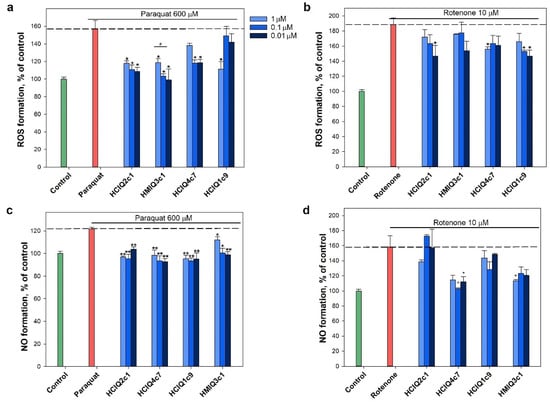 The peptides inhibited both rotenone- and paraquat-induced ROS formation (Figure 8a,b). The decrease in ROS levels caused by the peptides in the paraquat-induced cytotoxicity model was stronger than in the presence of rotenone. A reliable dose-dependent effect in the presence of paraquat was revealed for HMIQ3c1, with a maximum decrease in ROS levels (less than control level) of 36.9 ± 7.9% at a concentration of 0.01 μM. HCIQ2c1 and HCIQ4c7 at the same concentrations decreased ROS levels by 30.7 ± 1.8% and 24.6 ± 2.5%, respectively, while HCIQ1c9 inhibited ROS levels by 29.3 ± 5.6% at a concentration of 1 μM, a statistically significant result (Figure 8a). In the presence of rotenone, statistically significant decreases in ROS levels were revealed for HCIQ2c1 and HCIQ1c9 (by 22.0 ± 7.3% and 22.0 ± 4.2%, respectively) at a concentration of 0.01 μM, HCIQ4c7 inhibited ROS by 17.3 ± 1.7% at a concentration of 1 μM (Figure 8b). In addition, all peptides decreased NO formation induced by paraquat in a statistically significant manner (Figure 8c). HCIQ4c7 at a concentration of 0.01 μM showed a maximal effect, decreasing NO by 22.3 ± 2.4%, which was less than the control level. In the rotenone-induced toxicity model, the peptides (except HCIQ2c1) significantly decreased NO, while HCIQ4c7 at a concentration of 0.1 μM decreased NO to the control level (by 20.5 ± 0.1%), which was a statistically significant result (Figure 8d).