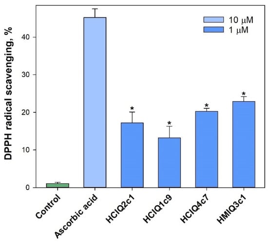 The studied peptides were tested for their ability to scavenge radicals using a DPPH radical scavenging cell-free assay. The obtained results revealed that all peptides reduced the DPPH radicals (Figure 9). The maximum antiradical effect was shown for HMIQ3c1, which scavenged 22.9 ± 1.3% of DPPH radicals.