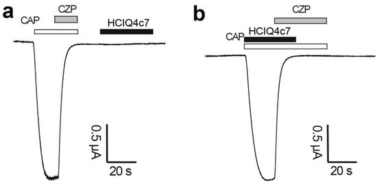 Effect of HCIQ4c7 on TRPV1 channels expressed in X. laevis oocytes. Whole-cell current traces of capsaicin (CAP = 2 µM) and capsazepine (CZP = 10 µM). Applications of HCIQ4c7 alone (a) or in the presence of capsaicin (b) are shown. The image was taken using pClamp Clampfit 10.0 (Molecular Devices, Downingtown, PA, USA) and Origin 7.5 software (Originlab, Northampton, MA, USA).