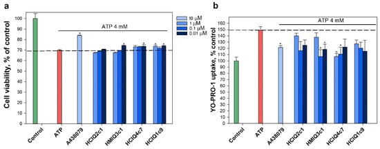 To establish whether 4 mM ATP leads to the death of Neuro-2a neuroblastoma cells, the cells were incubated with or without ATP for 48 h, and the percentage of viable cells was then determined via MTT assay. Incubation with 4 mM ATP led to a significantly increased percentage of total dead cells (up to 30.15 ± 0.68%) compared with that in control cells (Figure 11a). To determine whether ATP-induced Neuro-2a cell death is caused by P2X7R activation, the cells were pre-incubated with or without 10 μM A438079, which is the inhibitor of P2X7R [], and then were incubated in the absence or presence of 4 mM ATP for 48 h. Pre-incubation of cells with 10 μM A438079 increased the cell viability by 21.3 ± 0.5% compared to the cells incubated with ATP alone, indicating that this process is partially mediated by P2X7R activation. The peptides (except HCIQ2c1) had a slightly protective effect on ATP-induced cells. Statistically significant increases in cell viability were observed for HCIQ4c7 (0.1 μM), HCIQ1c9 (0.01 μM), and HMIQ3c1 (0.01 μM), amounting to 4.7 ± 0.74%, 5.96 ± 0.72%, and 6.46 ± 0.65%, respectively, as compared to cells incubated with ATP. Nevertheless, the dependence of the cytoprotective properties of peptides on the studied concentrations is not clearly shown.