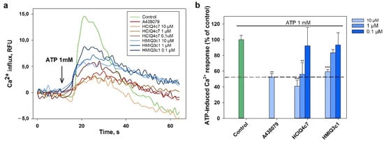 To determine whether HCIQ4c7 and HMIQ3c1 inhibit the activation of P2X7R, the Ca2+ influx induced by channel gating (pore expansion) was measured. Neuro-2a cells were loaded with the Ca2+-selective fluorescent probe Fluo-8, then cellular calcium responses were recorded. A large sustained increase in [Ca2+]i was recorded after the addition of 1 mM ATP, indicating that it was also mediated through the purinergic receptor. This increase was significantly reduced in the presence of 10 μM A438079 (Figure 12a). The peptides reduced the Ca2+ response at all tested concentrations (Figure 12b). A438079 decreased the calcium response by 47.7 ± 4.4% relative to the control level, while HCIQ4c7 and HMIQ3c1 at a concentration of 10 μM decreased the stable calcium response by 59.1 ± 7.8% and 40.6 ± 2.6%, respectively. These data indicate that the peptides are capable of affecting the P2X7R activation.