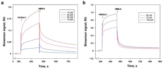Binding sensorgrams of immobilized P2X7R with HCIQ4c7 (a) and HMIQ3c1 (b) at 25 °C. Correspondence of line colors to the peptide concentrations is shown in frame. The injection times of the peptides and HEPES-buffered saline (HBS-N) are shown by a black arrow.