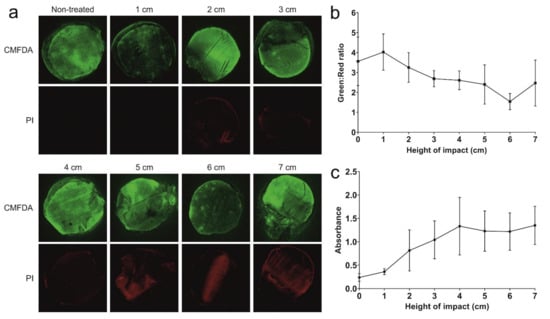 To confidently use the custom drop tower for downstream applications, it was first necessary to optimise the energy of impact. Explants were impacted from increasing heights at 1 cm intervals from 1 cm to 7 cm and visualised with CMFDA (green) and PI (red) staining at 72 h after impact under a macro-confocal microscope (Figure 1a). Increasing heights of impact resulted in a decreasing trend of green:red ratio, although this was not significant between no impact and any height of impact (Figure 1b). LDH in the media at 72 h also increased with greater heights, although not significantly (Figure 1c). LDH release seemed to stabilise after 5 cm impact. Based on these observations, an impact height of 5 cm was selected, as it was sufficient to induce reproducible levels of cell death.