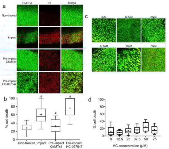 2.6. The TRPV4-Specific Blocker HC-067047 Does Not Prevent Impact-Induced Cell Death