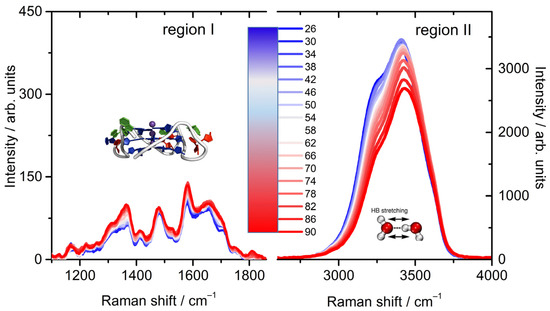 The potential of UVRR spectroscopy is here exploited by using the excitation wavelength λexc = 220 nm so as to separately enhance the chromophore-specific vibrations from a dG, dT, and dA basis [57,58], simultaneously acquiring the intense broad OH stretching region in the same spectrum. The whole collection of UVRR spectra of the Tel22 water solution, over the huge wavenumber range (1000–4000 cm−1), as a function of temperature is represented in Figure 1, where two main regions are separately enhanced: the first (I) over the 1300–1800 cm−1 range, mainly due to the Tel22 vibrations, and the second (II) over the 3000–3900 cm−1 range, related to the intramolecular structure of the H-bond network. The strength and novelty of the present work, therefore, resides in its ability to (1) jointly follow the trend of the vibrational features of both the solute and the solvent in a wide spectral profile with the high selectivity of the UVRR probe, and (2) to apply a bidimensional analysis over the Raman fingerprint regions to investigate whether or not those vibrations are correlated as the temperature is increased.