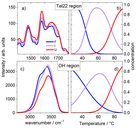 After this first step, we progressed with the SVD analysis over the OH stretching region (zone II, Figure 1), mainly attributed to water vibrations. Remarkably, we found that the F-I-U pattern is still valid, suggesting a connection between solvent and solute vibrational modes. We thus proceeded with a global fit of the two sets of data (I and II) using Equation (3) and by sharing the Tm1 and the Tm2 parameters. Through this, we were able to identify the transitional states in correspondence with the pre-melting and melting temperatures equal to Tm1 (44 °C) and Tm2 (76 °C), respectively. The whole set of thermodynamic parameters is reported in Table S2 in the Supplementary Materials. The significant species and relative concentrations are shown in Figure 2a–d.