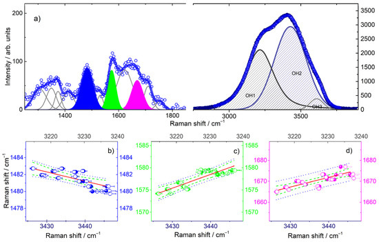 Altogether, the results of the data analysis performed over zones I and II of the spectra allowed us to obtain information on the trend as a function of the temperature of a set of group vibrations that are relevant in the melting process. Interestingly, we identified two kinks in the temperature behavior of the frequency position, related to both specific Tel22 vibrations (ν1482, ν1575 and ν1660) and OH stretching of close water structures (bands 1 and 2, i.e., νOH1 and νOH2). These kinks were fairly in correspondence with the Tm1 and Tm2 determined through the SVD analysis. Therefore, we investigated whether the changes in the former (ν1482, ν1575 and ν1660) were followed by a change in the latter (νOH1 and νOH2). From Figure 3b–d, it is apparent that all the data placed in relation show a linear dependence when represented as one against the other. In particular, by performing a fit of ν1482 vs. νOH1 (and vs. νOH2), ν1575 vs. νOH1 (and vs. νOH2), and ν1660 vs. νOH1 (and vs. νOH2), we obtained Pearson’s r values that were all above 0.75, indicating a quite good correlation between group vibrations of the G4 bases and OH stretching vibrations. This is a sign of the intimate correlation between solute and solvent molecular vibrations along the thermal pathway.