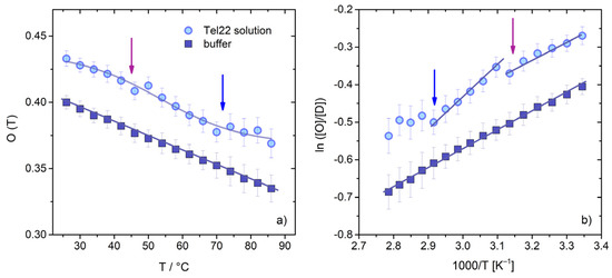 From the analysis of the temperature dependence of the OH stretching band, it is also possible to obtain the thermodynamic parameters related to the shift from an ordered (O) to a disordered (D) water structure in the presence of G4s. Specifically, the enthalpy variation ΔHO↔D of the process can be evaluated from the temperature dependence of the O↔D equilibrium, by means of a van’t Hoff treatment in which O(T) and 1-O(T) are the fraction of OH oscillators belonging to the O and D water species, respectively [68]. An example of the van’t Hoff plot is given in Figure 4b. Linear regression fitting ln([O]/[D]) vs. inverse temperature allowed for the calculation of the buffer enthalpy, ΔH = −1.10 ± 0.02 kcal/mol, which was in reasonable agreement with the value determined for pure water by means of UVRR (λexc 266 nm [63]). Conversely, for the Tel22 water solution, we observed a not-continuous trend as a function of temperature, characterized by a change in slope corresponding to an enthalpy variation from 1.07 ± 0.02 kcal/mol to 1.55 ± 0.06 kcal/mol in the pre-melting region. The visible variation at T’m1 (violet arrow) further testifies that the O↔D equilibrium was extremely sensitive to the intermediate conformational changes induced by temperature on the quadruplex secondary structure before complete unfolding.