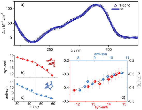(a) Experimental CD profile for the Tel22 K+ water solution at 45 μM and ambient temperature, shown together with the fitted curve (solid line) obtained by using the algorithm presented in Ref. [14]. (b,c) Percentages of syn–anti and anti–syn populations as a function of temperature (dotted line approximatively corresponds to T’m1). (d) Correlation plot between syn–anti and anti–syn populations and the quantity ln([O]/[D]).