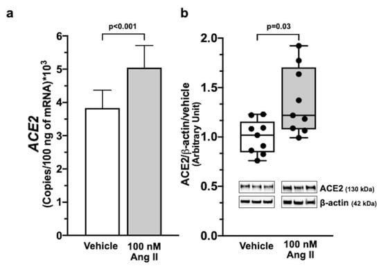 Ang II-induced ACE2 expression in Calu-3 cells. Ang II increased ACE2 mRNA and protein levels in Calu-3 cells as analyzed by digital droplet PCR (ddPCR) and Western blotting analysis. Panel (a) shows ACE2 gene expression after a 12 h exposure of Calu-3 cells to 100 nM Ang II (n = 5 in duplicate; median ± SEM). Immunoblots and histograms show that 100 nM Ang II increased ACE2 protein levels in Calu-3 cells after 48 h exposure. Data were normalized on vehicle and β-actin as a loading control (panel (b)) (n = 3 in triplicate; median ± QR).