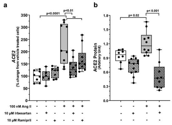 Cells were first exposed for 12 h to 100 nM Ang II (Cod. #A9525, Sigma-Aldrich, Milan, Italy), or to 10 µM of the ARB irbesartan (Cod. #I2286, Sigma-Aldrich, Milan, Italy), or to 10 µM of the ACEI ramipril (Cod. #R0404, Sigma-Aldrich, Milan, Italy), or to 10 µM of the ACE2 inhibitor MLN-4760 (Cod. #5306160001, Merck-Millipore, Vienna, AT, USA) added to fresh media 1 h before exposure to 100 nM Ang II.