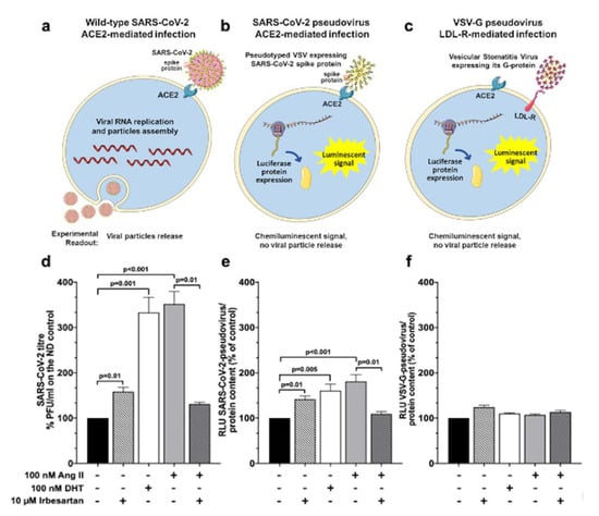 We further examined the mechanisms of virus infection using the luciferase expressing vesicular viral stomatitis (VSV) with its own natural attachment glycoprotein G protein [] to characterize the cell entry-enhancing mechanisms of Ang II, DHT, and irbesartan. Instead of ACE2, VSV recognizes the low-density lipoprotein receptor (LDL-R) [] and, therefore, allows the assessment of ACE2- and spike protein-independent cell entry (Figure 3, panel c).