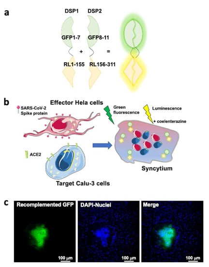 In order to investigate the modulation of SARS-CoV-2 entry mediated by the interaction of viral spike protein and ACE2, we used a cell–cell fusion assay, taking advantage of the system based on Dual Split Proteins (DSP) 1 and 2 developed by Matsuda et al. [,], where DSP1 reporter consists in the first seven β-strands of the green fluorescent protein (GFP) fused together with the first 155 amino acid residues of the Renilla luciferase enzyme (RL), while the DSP2 reporter consists of the remaining part of both GFP and RL (Figure 4 panel a and b). It is only within syncytia that DSP1 and DSP2 can self-associate, restoring a fully fluorescent GFP and a fully functional RL.