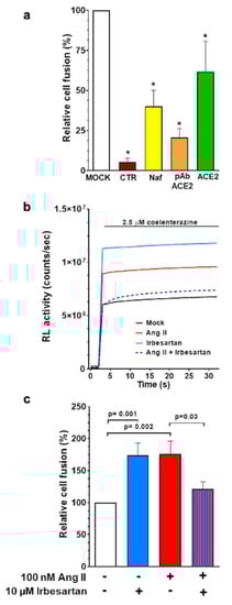 Taken together, these experiments demonstrate the obligatory role of the SARS-CoV-2 spike protein for cell–cell fusion efficiency and provide evidence that Ang II markedly enhanced Calu-3 cell infection by acting via AT1R, as its effects of cell fusion efficiency were blunted by irbesartan (Figure 5, panels b and c).