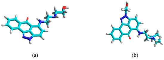 Anthrapyrazoles are synthetic anticancer drugs, synthesized in order to retain high levels of the wide spectrum of antitumor activity in anthracyclines (e.g., doxorubicin), while at the same time, diminishing cardiotoxicity by reducing the potential to generate semiquinone free radicals in cardiac cells [1,2]. Although there was a broad range of antitumor activity in model tumors [1,3], they revealed diversified activity in doxorubicin-resistant cells [4]. The action mechanism of these planar compounds is based on DNA intercalation, topoisomerase II inhibition of DNA synthesis, and DNA strand breaks [2]. Structurally, anthrapyrazoles are similar to mitoxantrone, but their structure has to be modified to reduce the abovementioned side effect. Attempts to reduce the toxicity of anthracyclines have led to the development of various anthrapyrazole derivatives, including teloxantrone (Ci-937, DUP-937, molecule a-60, which is studied in this work), piroxantrone (CI-942, DUP-492, molecule a-58, which is studied in this work), and finally losoxantrone (CI-941, DUP-941), with reduced side effects and increased efficacy in patients with breast cancer. Those three anthrapyrazoles even underwent clinical trials, and in phase II trials, they exhibited significant response rates in women with metastatic breast cancer [3]. Losoxantrone has shown impressive cytotoxic activity on a wide range of tumor cell lines (virtually the same spectrum of antitumor activity as mitoxantrone) with predicted potential to replace anthracyclines through a more favorable therapeutic index [1]. What is more, is that a response rate of 63% in women with metastatic breast cancer was observed in the study conducted by Talbot et al. [5].