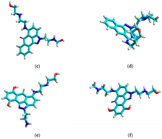 Geometrically optimized structures of selected anthrapyrazole derivatives: (a) a-01; (b) a-08; (c) a-18; (d) a-30; (e) a-50; (f) a-60.