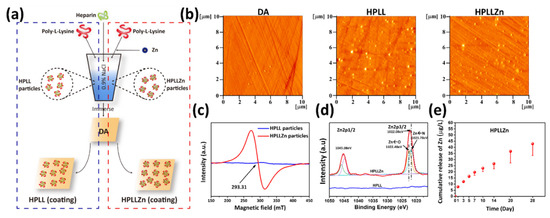 (a) Schematic illustration of the preparation of HPLL and HPLLZn. (b) AFM images of DA, HPLL, and HPLLZn. (c) The EPR spectra of HPLLZn particles used for coating preparation. (d) Zn 2p XPS spectrum of coatings. (e) Quantitative characterization of Zn leaching from HPLLZn (DA, dopamine coating; HPLL, heparin/poly-L-lysine coating; HPLLZn, heparin/poly-L-lysine/Zn coating).