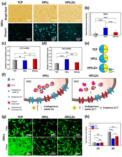 In this experiment, TCP was considered as the negative control group for the endogenous labile Zn research. Compared with normal SMCs, which showed almost no Zinquin fluorescence on TCP, the enhancement in the Zinquin fluorescence in SMCs on HPLL was completely caused by an increase in endogenous labile Zn. Although this work cannot determine the precise source of Zn in the fluorescence of HPLLZn, the source of this part of Zn is at most the sum of endogenous labile Zn and exogenous Zn. Because the Zinquin fluorescence intensity in HPLLZn is less than HPLL, it can be judged that HPLLZn cells have less endogenous labile Zn than HPLL (Figure 4f).