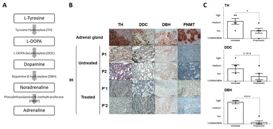 Enzymes implicated in catecholamine biosynthesis pathway are expressed in IH tissues and their expressions are decreased by propranolol treatment. (A) Catecholamine biosynthesis pathway is shown. (B) All catecholamine biosynthesis enzymes except PNMT are expressed in IH tissue, enabling them to synthesize dopamine and NA. Expression levels of these enzymes are reduced with propranolol treatment. The adrenal gland is used as a positive control. Expression levels of catecholamine biosynthesis enzymes in untreated patients are different from treated patients. Two representative pictures of 5 untreated patients and 5 propranolol-treated patients are shown. Scale bar size is 100 µm. NA: noradrenaline, IH: infantile hemangioma. (C) Immunostained sections were scored considering the intensity of TH, DDC and DBH in a blinded manner for 5 untreated patients and 5 propranolol-treated patients. Data are represented as mean ± SEM, * p < 0.05, **** p < 0.0001.