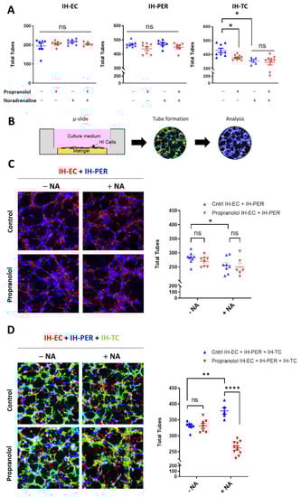 Altogether, our results indicate that the combination of three IH-derived cell types (i.e., EC, PER and TC) and exogenous NA is critical for detecting an efficient inhibitory effect of propranolol on the capillary-like tube formation in vitro.