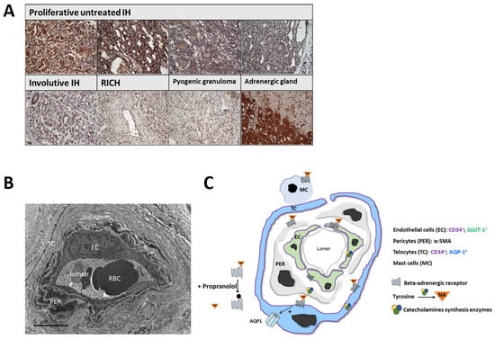 Proliferative IH tissues present some features of neuroendocrine tumors. (A) Immunostaining for Chromogranin A (CgA) counterstained with hemalun. CgA-positive cells appear in brown. Scale bar size is 100µm. While high expression levels of CgA are detected in untreated proliferative IHs, low levels are detected in involutive IHs and other vascular tumors, including rapidly involutive congenital hemangiomas (RICH) and pyogenic granulomas. The adrenal gland used as a positive control. (B,C) Model outlining IH responses to propranolol. (B) Electron microscopy of IH vessel showing endothelial cells surrounded by pericytes and telopodes of telocytes in perivascular space. Scale bar size is 5 µm. (C) IH-EC, -PER and -TC express the first three enzymes involved in catecholamine biosynthesis pathway, enabling them to release NA locally. Our previous data [,] demonstrated that beta-adrenergic receptors are present on IH-EC, -PER, -TC and mast cells. It is likely that NA-mediated activation of ADRB in an autocrine and/or paracrine manner results in activation of proangiogenic signaling pathways in different cell types, leading to dramatic growth and development of blood vessels. Propranolol antagonizes a proangiogenic NA effect through binding to ADRB receptors. NA: noradrenaline, IH: infantile hemangioma.