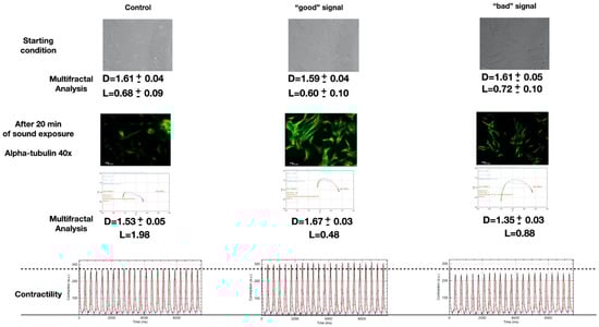 (Modified from [8]). The first row shows the starting condition using bright-field images (representative images selected from 5 positions and 6 experimental repetitions). The cells have a basal multifractal arrangement characterized by an average fractal size (D) of about 1.6 and a lacunarity (L) of 0.7. Scale: 10 μm. The middle row represents the result of the different sound stimulations. Alpha-tubulin was marked in green. In the control cells, there were no significant variations in the parameters D and L. In the case of “good” sounds, there was an increase in the D to 1.7 and a decrease in the L to 0.4. In the case of “bad” signals, the D reduced to 1.3 with a slight increase in the L to 0.8. Scale: 10 μm. The lower row shows the contractility analysis of the same cell under the different acoustic stimulations.