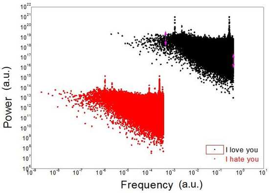 FFT of the “I love you (ti amo)” (black points, upper graph) and “I hate you (ti odio)” (red points, lower graph) signals used in our previous work [8].