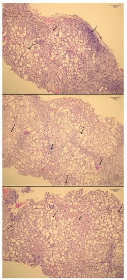 Non-alcoholic fatty liver disease (NAFLD) is an entity that includes different histological features from simple steatosis to non-alcoholic steatohepatitis with and without fibrosis []. It is characterized by steatotic changes in hepatocytes that are not a consequence of alcohol intake [,]. Histologically, simple steatosis and non-alcoholic steatohepatitis (NASH) are distinguished. In simple steatosis, more than 5% of hepatocytes show signs of steatosis but not signs of inflammatory damage and fibrosis. In contrast, in non-alcoholic steatohepatitis, more than 5% of hepatocytes are steatotic, but there are visible signs of ballooning hepatocytes: inflammation with the possibility of fibrosis [,]. Some studies have shown that the incidence of NAFLD in the world population is approximately 25%, but there are differences in terms of geographical area, ethnicity, race, and gender [,]. For example, the highest frequency was observed in the Middle East and the lowest in Africa [,]. In addition, in the United States, Latinos have the highest prevalence of the disease, while the lowest is present in Black population []. Regarding the difference between the genders, NAFLD and NASH are more common in men [,]. As mentioned earlier, NASH is an inflammatory form of NAFLD that occurs with progression in about 10–25% of patients with previously confirmed NAFLD []. About 20% of patients with NASH develop liver cirrhosis as a final consequence, which, in the most severe cases, requires transplantation [,]. It is believed that in the coming years, NASH, which according to previous studies is in third place, will overtake liver cirrhosis, which is caused by alcohol abuse and hepatotropic viruses and is the leading cause requiring liver transplantation in women []. In addition, patients with confirmed NASH have a significantly higher risk of developing hepatocellular carcinoma compared to the general population and even 12 times higher annual risk compared to patients with uncomplicated NAFLD [,,].