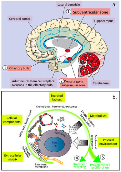 - Morante-Redolat, J.; Porlan, E. Neural Stem Cell Regulation by Adhesion Molecules Within the Subependymal Niche. Front. Cell Dev. Biol. 2019, 7, 102. [Google Scholar] [CrossRef]