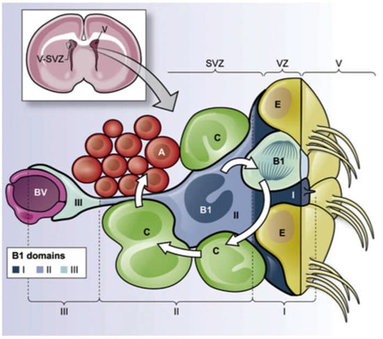 - Fuentealba, L.; Obernier, K.; Alvarez-Buylla, A. Adult neural stem cells bridge their niche. Cell Stem Cell 2012, 10, 698–708. [Google Scholar] [CrossRef]