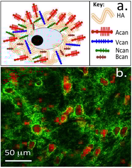 - Hayes, A.; Melrose, J. Aggrecan, the Primary Weight-Bearing Cartilage Proteoglycan, Has Context-Dependent, Cell-Directive Properties in Embryonic Development and Neurogenesis: Aggrecan Glycan Side Chain Modifications Convey Interactive Biodiversity. Biomolecules 2020, 10, 1244. [Google Scholar] [CrossRef]