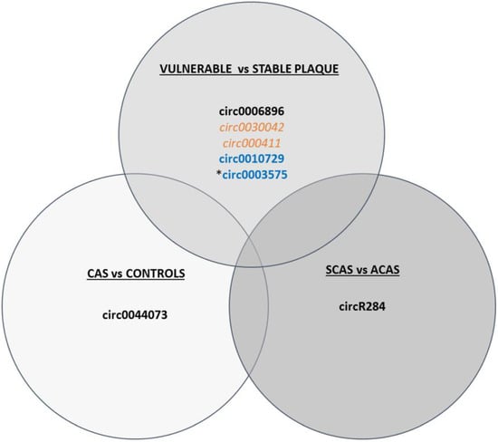 - Bazan, H.A.; Hatfield, S.A.; Brug, A.; Brooks, A.J.; Lightell, D.J.; Woods, T.C. Carotid Plaque Rupture Is Accompanied by an Increase in the Ratio of Serum circR-284 to miR-221 Levels. Circ. Cardiovasc. Genet. 2017, 10, e001720. [Google Scholar] [CrossRef] [Green Version]