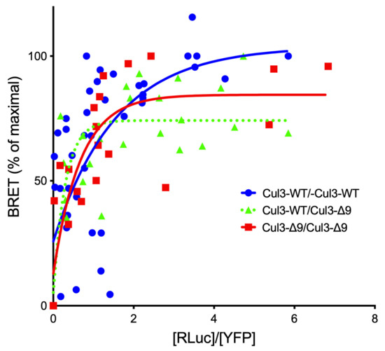 As expected, CUL3 was the major protein identified in both purifications (Mascot scores: 6127 and 6718 (Table S1A,B, respectively)). The presence of tryptic peptides corresponding to exon 9 sequence in the PrC-CUL3-∆9 immunocomplexes suggested that CUL3-WT and CUL3-∆9 assembled as heterodimers. It is well established that CRL3 enzymes function as dimers [11], but whether they are CUL3-∆9 homo- or heterodimerizes has not been fully investigated. The BRET technique was used to investigate this point. Briefly, CUL3-WT and CUL3-∆9 were tagged with either a bioluminescent protein (luciferase) as donor or a fluorescent protein (YFP) as acceptor. The two tagged proteins were co-expressed with a fixed amount of the donor protein and increasing amounts of the acceptor protein. In the absence of close proximity (>10 nm), a linear curve is observed. In the case of close proximity (i.e., interaction), non-radiative energy transfer is observed between the two proteins, and the BRET signal rapidly increases to reach a plateau when all the donor protein is saturated by the acceptor protein. This specific interaction demonstrated a hyperbolic curve when the BRET signal (Y axis) is plotted to the [Luc]/[YFP] ratio (X axis). The value of [Luc]/[YFP] ratio for a 50% BRET signal (BRET50) could potentially reflect the affinity of the two partners [12]. We showed that the CUL3-WT homodimer presents an apparent high affinity (BRET50 CUL3-WT/WT = 0.24 ± 0.1 (n = 4)) and that CUL3-∆9 homodimerizes but also can heterodimerize with CUL3-WT, albeit with a slightly lower apparent affinity (BRET50 CUL3-∆9/∆9 = 1.27 ± 0.4 (n = 3); p = 0.04 and BRET50 CUL3WT/∆9 = 0.45 ± 0.24 (n = 3)) (see for details Figure 2. This observation may explain the dominant negative effect of CUL3-∆9.