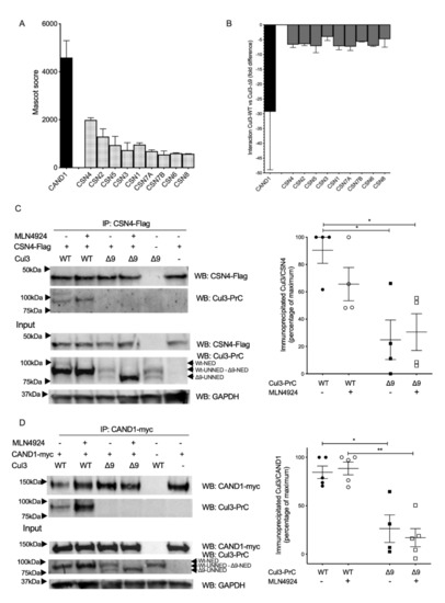 The second major regulator of the CRL3 complex is Cullin-associated and neddylation-dissociated protein 1 (CAND1). CAND1 interacts with the entire sequence of unneddylated Cullins (Figure 1A) to promote the exchange of substrate adaptors [16,17,18,19]. In our label-free mass spectrometry experiments, CAND1 bound more efficiently to PrC-CUL3-WT with ratios ranging from 10 to 49-fold as compared to CUL3-∆9 (Figure 4B).