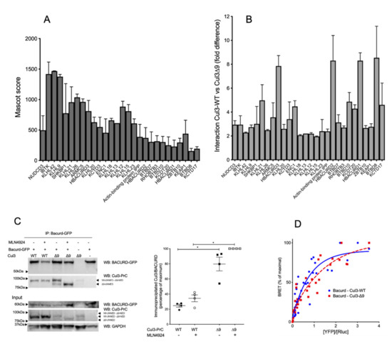 CUL3-WT and CUL3-∆9 interactions with BTB-proteins. Upper part: (A). and (B). interactions of BTB proteins with CUL3-WT and CUL3-∆9 analyzed by MS/MS. PrC-CUL3-WT and PrC-CUL3-∆9 were immunoprecipitated with HPC4 antibody, and the immunoprecipitate was analyzed by mass spectrometry. The abundance, as assessed by the Mascot score (A) and the difference in the interaction of BTB-proteins (B) with PrC-CUL3-WT and PrC-CUL3-∆9 are shown. Lower part: interactions of Bacurd with CUL3-WT and CUL3-∆9 analyzed by co-immunoprecipitation and BRET. (C). Bacurd-GFP was transfected in PrC-CUL3-WT or PrC-CUL3-∆9 inducible cell lines (see Materials and methods). Cells were induced (or not) with tetracycline (10 µg/mL) 32 h post-transfection and treated (or not) with MLN4924 (1µM) (Millenium Pharmaceuticals) 42 h post-transfection. Co-immunoprecipitation of Bacurd-GFP was performed by GFP-Trap followed by SDS-PAGE and transfer to nitrocellulose. On the left, a representative gel of the co-immunoprecipitation experiment blotted with the HPC4 (CUL3) and GFP (Bacurd) antibodies is shown. On the bottom, a Western blot of the same cellular extracts for Bacurd, CUL3, and GAPDH is shown. On the middle, a scatter plot of the results obtained for three experiments is presented. The results are expressed as the percentage of the maximal ratio of immunoprecipitated CUL3/Bacurd normalized on the CUL3/GAPDH ratio observed on the input gel. Statistical comparisons used the Kruskal–Wallis test on CUL3/Bacurd ratios (* = p < 0.05). (D). The interaction of nanoluc-Bacurd with YFP-CUL3-WT and YFP-CUL3-∆9 was analyzed by BRET experiments, as shown in Figure 2. Similar hyperbolic curves were obtained for CUL3-WT and CUL3-∆9, with non-significant different BRET50 (0.71 ± 0.16 and 1.01 ± 0.2, respectively, n = 3, p = 0.304). Statistical comparisons used the Student’s t test.