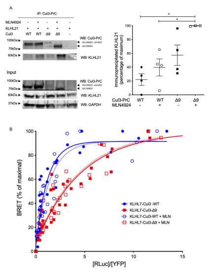 This study was extended to two other BTB-domain proteins, i.e., KLHL21, which regulates cell cycle and cell motility [22,23], and KLHL7, the mutations of which are involved in retinitis pigmentosa [24,25]. The increased interaction of KLHL21 with CUL3-∆9 that was observed in mass spectrometry experiments (6.3-fold, p = 0.03 and 3.7-fold p = 0.01 in the two experiments (Table 1)) was confirmed by co-immunoprecipitation experiments (Figure 6A).