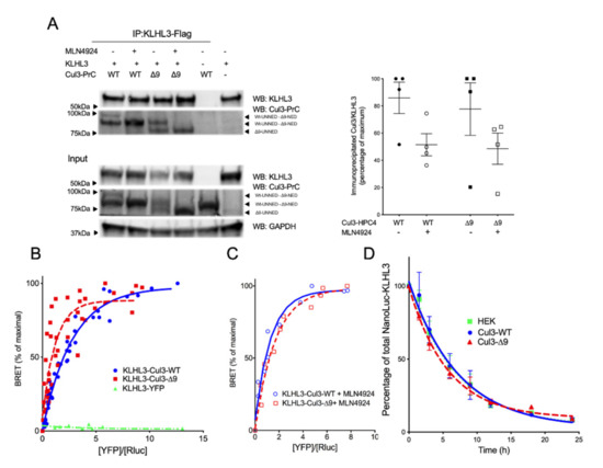 Dimerization, interaction and degradation of KLHL3. (A.) Interactions of CUL3-WT and CUL3-∆9 with KLHL3 Flag-KLHL3 was transfected in PrC-CUL3-WT or PrC-CUL3-∆9-inducible cell lines (see Materials and Methods), induced (or not) with tetracycline (10 µg/mL) for 16 h and treated (or not) with MLN4924 (1 µM) for 5 h. Co-immunoprecipitation of KLHL3 was performed using M2 Flag antibodies followed by SDS-PAGE and transfer to nitrocellulose. The left shows a representative gel of the co-immunoprecipitation experiment blotted with the polyclonal HPC4 (Cell signaling) and Flag-KLHL3 (Sigma) antibodies. The bottom shows a Western blot of the same cellular extracts for CUL3, KLHL3, and GAPDH. On the left, a scatter plot of the results obtained for four experiments is presented. The results are expressed as the percentage of the maximal ratio of immunoprecipitated CUL3/KLHL3 normalized on the CUL3/GAPDH ratio observed on the input gel. Statistical comparisons used the Kruskal–Wallis test on CUL3/KLHL3 ratios and were not significant. (B). The interaction of Luc-KLHL3 with YFP-CUL3-WT and YFP-CUL3-∆9 was analyzed with BRET experiments, as shown in Figure 2. Both CUL3-WT and CUL3-∆9 strongly interacted with KLHL3 in BRET experiments, but the BRET50 was significantly lower for CUL3-∆9 (0.9115 ± 0.33) as compared to CUL3-WT(1.855 ± 0.2) (p = 0.0478, n = 3). Statistical comparisons used the Student t test. (C). This twofold difference in the BRET50 is abolished by the pretreatment of the cells with MLN4924, the inhibitor of neddylation (BRET50 = 0.9143 and 1.172 for CUL3-WT and CUL3-∆9, respectively). (D). For KLHL3 degradation, Flp-InTM T-RExTM 293 cells stably transfected with PrC-CUL3-WT or PrC-CUL3-∆9 were transfected with Nanoluc-KLHL3. Twenty-four hours post-transfection, cells were treated with tetracycline (10 ng/mL) and 12 h later with cycloheximide and collected at different time points. Luminescence of KLHL3 was measured using a Mithras LB940 plate reader. Results are expressed as the percentage of the initial luminescent signal as a function of time (h). Similar decreasing curves were observed for KLHL3 in the presence of CUL3-WT or CUL3-∆9 with a half-life of 4.24 ± 0.75 h and 4.55 ± 0.58, respectively (n = 4; p = 0.7521). The Student t test was used for statistical comparisons.