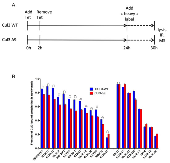 Cycling of CRL3-WT and CRL3-∆9 complexes analyzed by a SILAC experiment. (A). Flp-InTM T-RExTM 293 cells stably expressing PrC-CUL3-WT or PrC-CUL3-∆9 were transiently (2 h) induced with tetracycline in a normal “light” medium for 24 h, before switching them to a medium formulated with isotopically heavy lysine and arginine (“heavy” medium). After 6 h of incubation in “heavy” medium cells were lysed, prC-CUL3 was immunoprecipitated and the immunocomplexes were analyzed by SILAC quantitative mass spectrometry. (B). Twenty-one BTB-domain proteins (previously shown as differentially interacting with CUL3-WT and CUL3-∆9 in our label-free experiments) presented a newly made fraction > 0.2 in SILAC experiments. Among those 21 BTB adaptors, 12 had a statistically lower “newly synthetized” fraction in CUL3-∆9 complexes compared to CUL3-WT ones (left). Eight BTB adaptors presented no statistical difference in the distribution of “newly synthesized” fraction in CUL3-∆9 or CUL3-WT complexes (right). Only one presented a higher newly synthetized fraction in CUL3-∆9 complexes (middle). These results suggest that CUL3-∆9 is less performing in adaptor exchange and could inhibit CUL3-WT normal function by sequestering some abundant BTB adaptors, thus disturbing their “free” pool inside the cell. ** p < 0.05, * p < 0.01