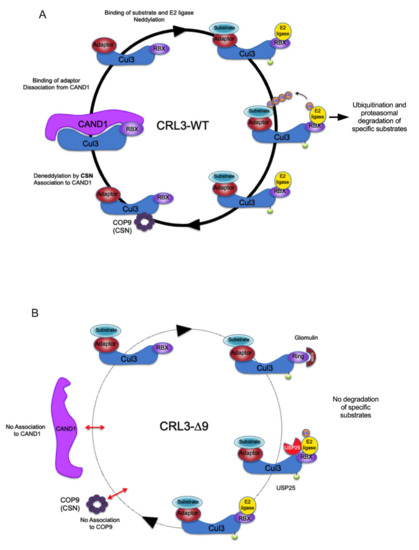 Hypothetical model of the functional defects of CUL3-∆9 CRL complex. (A). Classical model of CRL3 cycling. The different partners of the CRL3 cycle are indicated. The Cul3-Rbx1/CAND1 complex is inactive (left). Its dissociation allows the binding of adaptor and substrate and the neddylation of CUL3. This potentially active complex binds an E2 ligase and ubiquitinates the substrate, leading to the degradation by the proteasome. After substrate ubiquitination, the CRL3 complex interacts with the COP9 signalosome, resulting in the deneddylation of CUL3. The dissociation from the adaptor allows the re-association with CAND1. The different partners of the CRL cycle are indicated. (B). In the presence of CUL3-∆9, the CRL3 is unable to bind to COP9 (CSN4) and therefore to be deneddylated and to bind to CAND1. This interrupts the CRL3 cycle, which is essential for the recruitment of correct adaptors and substrates. In addition, the association of CUL3-∆9 to glomulin and USP25 could produce neddylated but potentially inhibited CRL3 complexes.