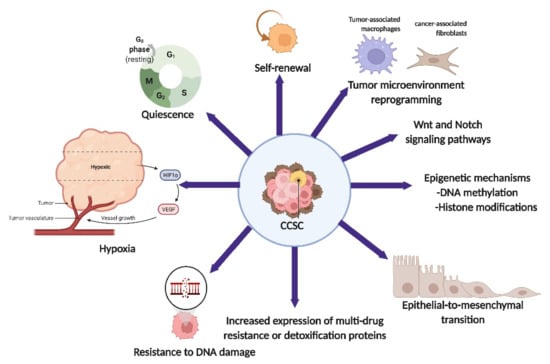 Surgery, chemotherapy (particularly cisplatin), and radiotherapy have improved the overall survival of patients with CC. However, the presence of CCSCs that are resistant to chemo- and radiotherapy leads to disease relapse and a reduction in overall survival []. CCSCs can develop resistance to standard treatments via different mechanisms (Figure 1), which are further described in detail below. Owing to their tumorigenicity, CSCs may be the route of cervical carcinogenesis, leading to distant metastasis. Therefore, therapeutic management specifically targeting CSCs is a potential tool for preventing chemo/radio-resistance and decreasing the risk of distant metastasis, tumor relapse, and the generation of secondary tumors, thereby increasing the chances of CC patient survival []. The identification of CCSC and a deeper understanding of their microenvironment will enable their specific pharmacological targeting [].