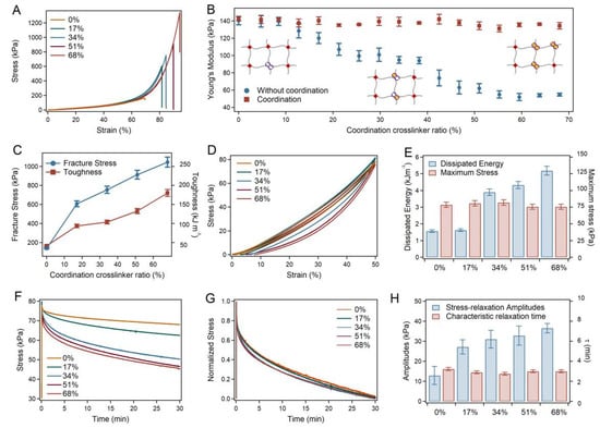 - Sun, W.; Xue, B.; Fan, Q.; Tao, R.; Wang, C.; Wang, X.; Li, Y.; Qin, M.; Wang, W.; Chen, B.; et al. Molecular engineering of metal-coordination interactions for strong, tough and fast-recovery hydrogels. Sci. Adv. 2020, 6, eaaz9531. [Google Scholar] [CrossRef] [PubMed] [Green Version]
