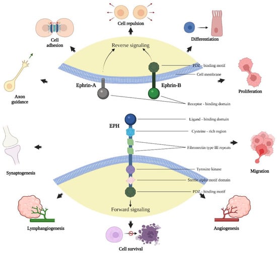 Structure of EPHs and ephrins and the presentation of some physiologic processes mediated through the EPH/ephrin signaling pathway. Created with BioRender.com, accessed on 2 May 2022.