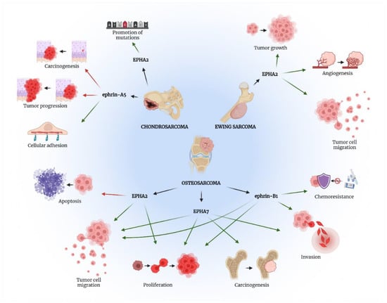 The role of EPH/ephrin axis in bone sarcomas’ pathogenesis. Green arrows present procedures promoted by the specific EPH/ephrin member, while red arrows show processes suppressed by the aforementioned molecules. Created with BioRender.com, accessed on 2 May 2022.