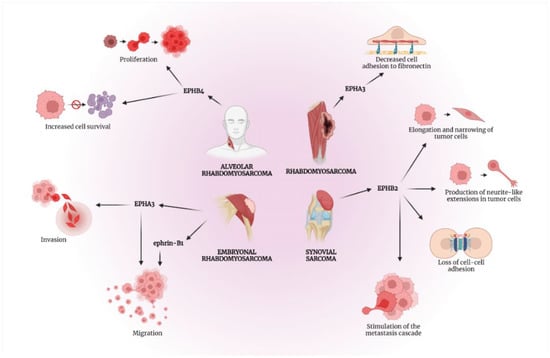 Evidence from published studies suggest the important role of EPH/ephrin signaling in the progression of rhabdomyosarcoma, which represents a highly malignant and a fast-growing soft tissue tumor. Rhabdomyosarcoma is the most commonly observed type of soft tissue sarcoma in children and adolescents [26]. Embryonal rhabdomyosarcoma (ERMS), alveolar rhabdomyosarcoma (ARMS) and spindle cell-sclerosing rhabdomyosarcoma (SRMS) comprise the three major histological subtypes, which arise from mesenchymal progenitor cells due to developmental disruptions instead of being differentiated into striated muscle cells [26]. Initially, a dysregulation of mRNA expression levels for EPHs and ephrins was noted by Berardi et al. in rhabdomyosarcoma cell lines compared to normal muscle cells [27]. In ERMS primary tumors and cell lines, the overexpression of ephrin-B1 was associated with increased measured levels of EPHB1 and EPHB3. Similarly, the overexpression of ephrin-B2 was correlated with the overexpression of EPHB1, EPHB2 and EPHB4 for the same histological subtype [27]. However, no specific correlations were found between EPHs and ephrins in ARMS tumors [27]. Overall, the global deregulation of EPHs and ephrins could justify metastatic features in rhabdomyosarcoma, such as increased motility, due to cell–cell detachment and higher invasiveness [27].