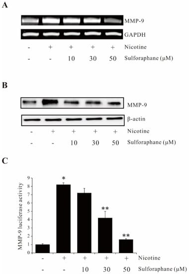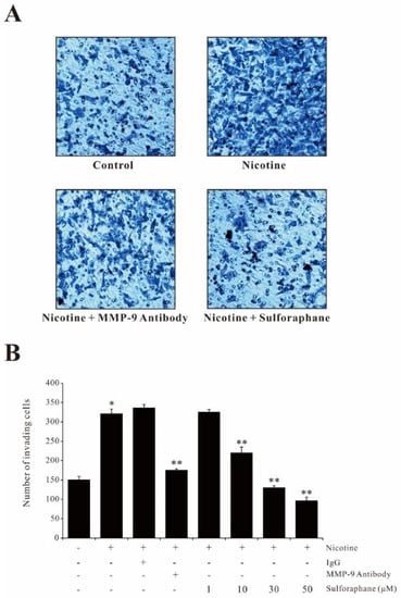 2.1. Sulforaphane Suppresses Nicotine-Induced MMP-9 Expression in AGS Cells